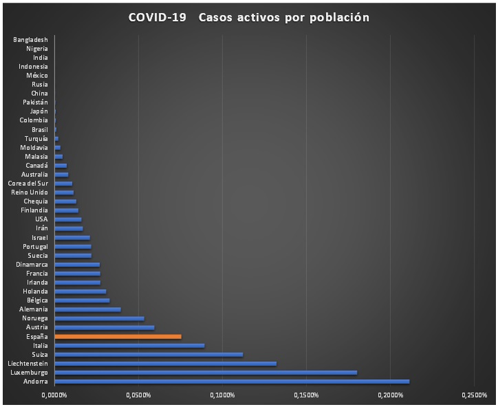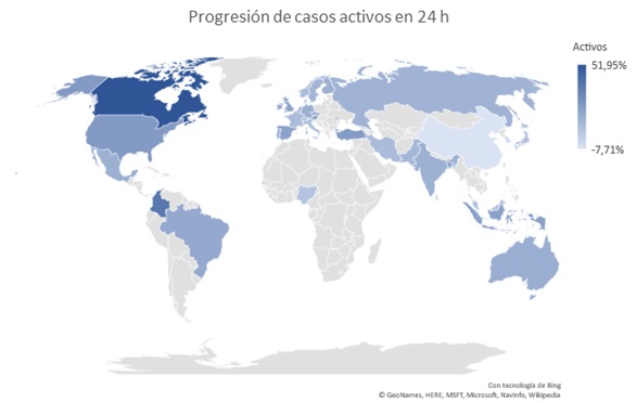 Este gráfico puede que sea el más relevante, el aumento relativo de los número de casos activos en las 24 horas del día 24 de marzo. Los países con mayor crecimiento de casos activos son: Canadá, Colombia, Israel, Luxemburgo y USA.