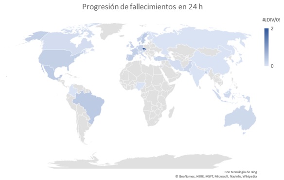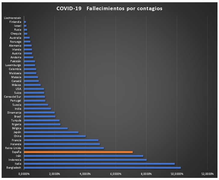Por relatividad con respecto al número de casos, los países que han sufrido un mayor aumento de fallecimientos son: Portugal, Bélgica, Brasil, Austria y México.