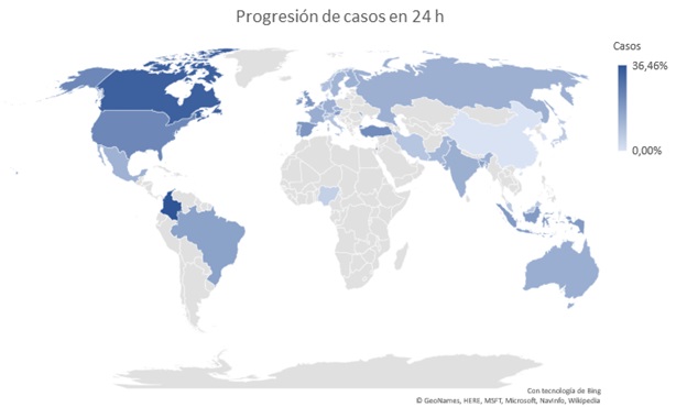 Colombia, Israel, Canadá, Luxemburgo y Andorra son, en este orden, los países que más han incrementado el número de contagios durante este día.