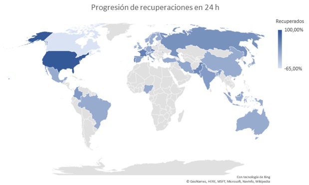 Estos resultados hay que tomarlos con mucha cautela pues, tras más de una semana haciendo seguimiento diario, he detectado que hay países que aportan más información sobre las recuperaciones que del resto de datos. Aún así, los cinco países que objetivamente han conseguido recuperar más pacientes, sobre la cifre del día anterior son: USA, Chequia, Portugal, Francia y Pakistán